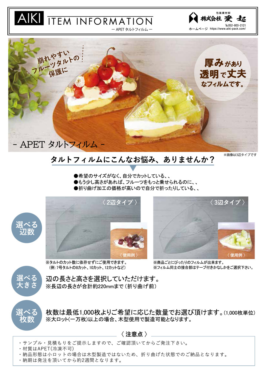 東海3県を中心に長年の実績。和洋菓子、ベーカリー、カフェ、テイクアウト用資材は愛起へお任せ下さい。
